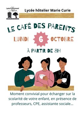 Le café des parents reprends : nous vous attendons le 6 octobre à partir de 8h pour échanger librement avec vous sur la scolarité de vos enfants, leur vie au lycée etc...